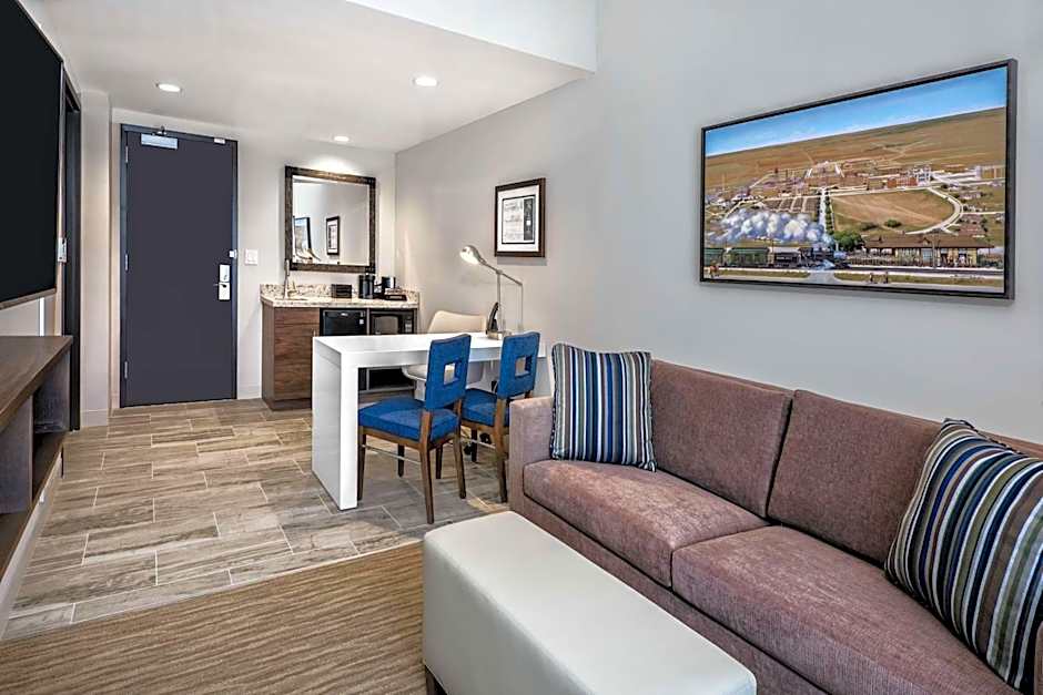 The air-conditioned suite is furnished with a desk and a seating area.